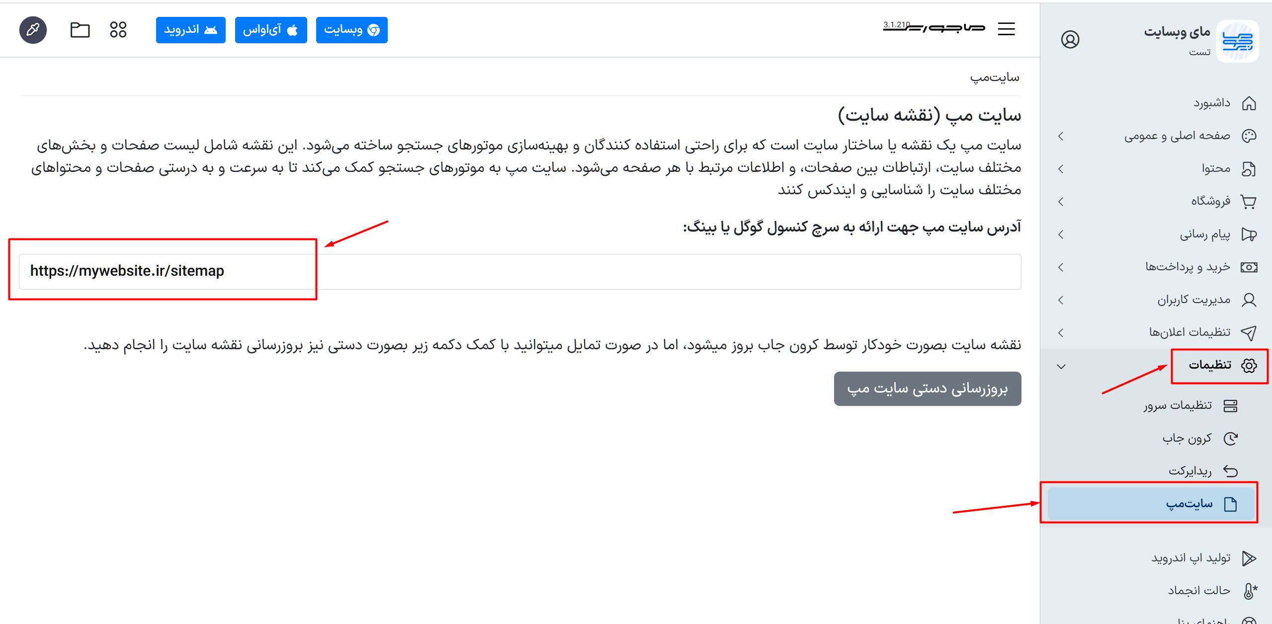 در پنل ماجوریس وارد تنظیمات / سایت مپ شوید و آدرس سایت مپ خود را که معمولا آدرس سایت شما و در انتها /sitemap میباشد را کپی نمایید: