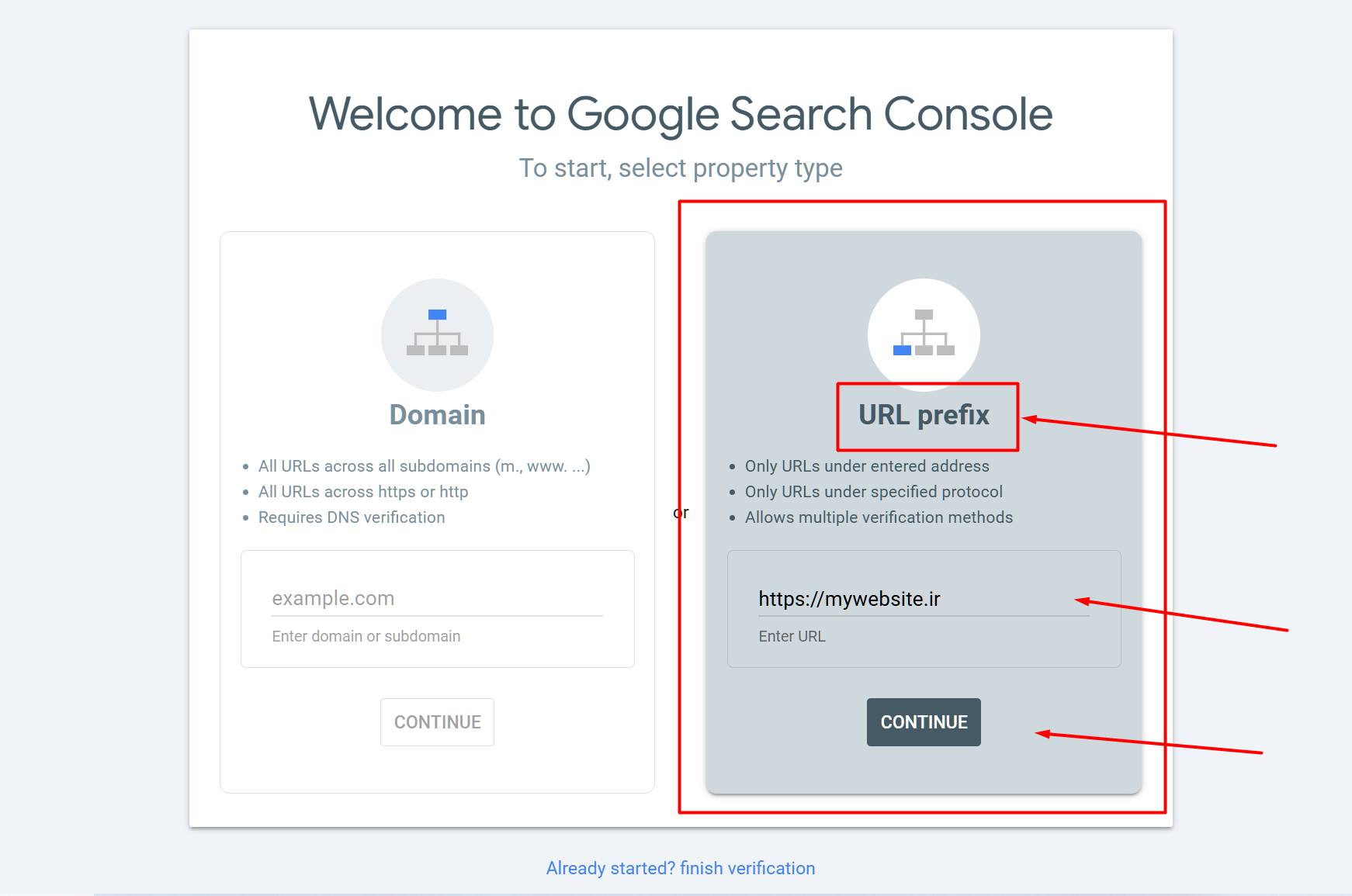 در گام بعدی گزینه URL Prefix را انتخاب کرده و آدرس وبسایت خود را وارد کرده و بروی گزینه Continue کلیک نمایید: