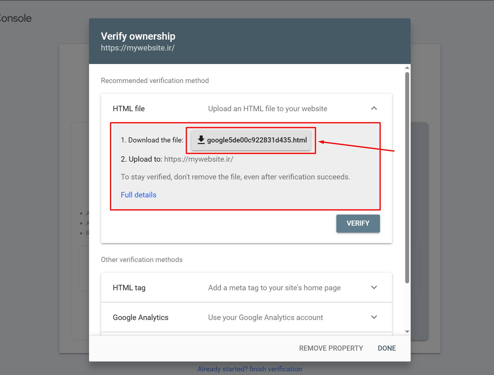 در قدم بعدی گوگل برای دامنه شما یک فایل احراز مالکیت اختصاصی ایجاد میکند که میتوانید آن را دانلود نمایید.