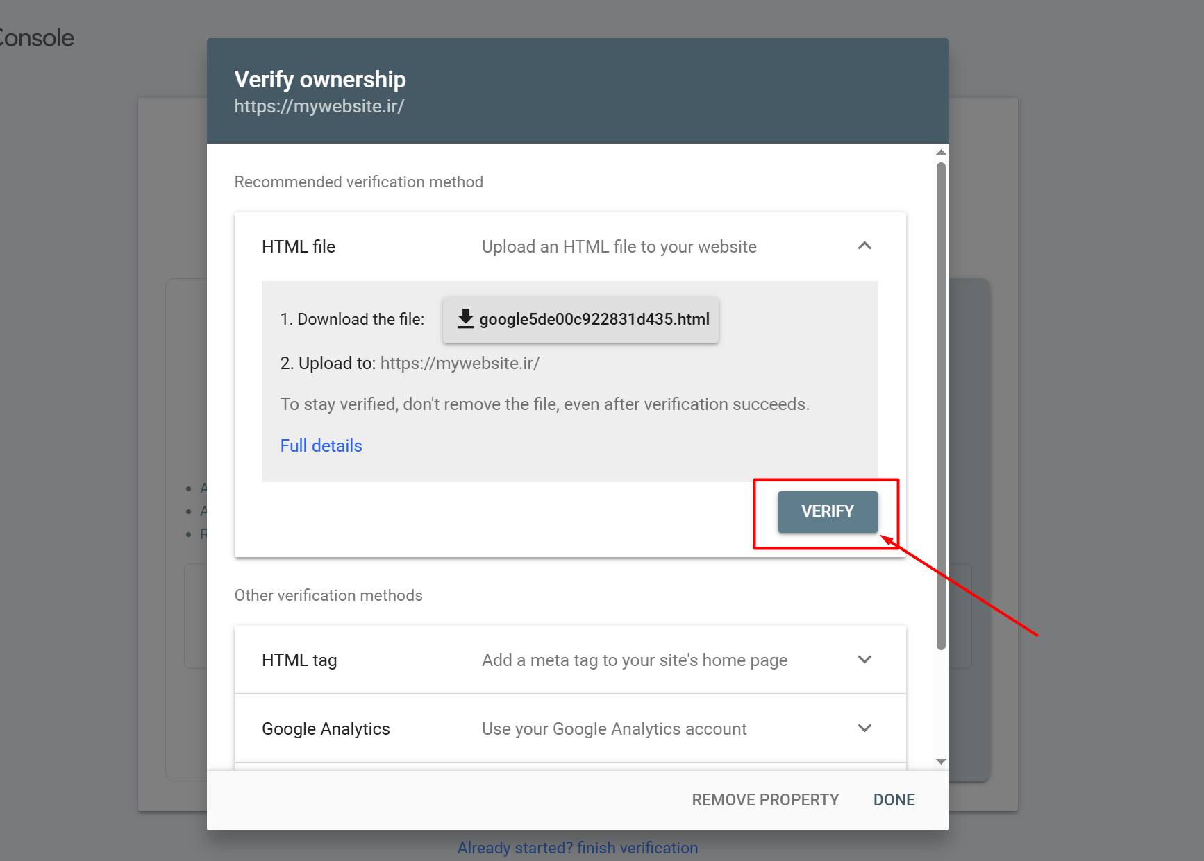 سپس به سرچ کنسول بازگردید و بروی وریفای Verify کلیک نمایید. در صورتی که فایل را در محل درستی آپلود کرده باشید پس از کلیک بروی Verify وارد محیط سرچ کنسول خواهید شد و در غیر اینصورت خطا دریافت میکنید.