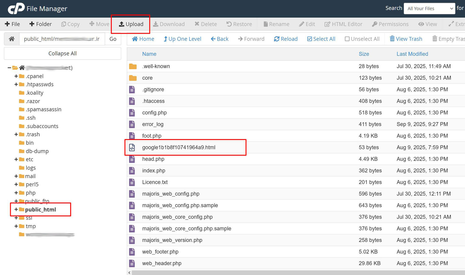 در این مرحله لازم است وارد پوشه public_html شوید (محل نصب اسکریپت وب ماجوریس) و فایل دانلود شده از مرحله قبل را با کمک گزینه آپلود در این پوشه آپلود نمایید. (مطابق تصویر زیر)